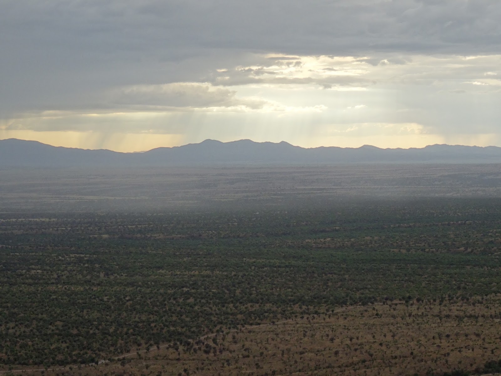 The next morning, we were off to Tombstone with a stop at a supposed ghost town along the way...one building selling souvenirs doesn't make a ghost town in my book. But we talked to the lady in the store for a few minutes and went on our way. Tombstone has a lot of history and it is trying to hang on to its past with tours, a few bars & the expected kookiness of pretending to shoot each other with cap guns and charge $8 a head to watch. I wanted to tell them you could see the real thing in most major cities for nothing but I passed on that...and I kept my $16 in my pocket too. We did go on a short trolley ride and listen to the silly jokes & comments as we drove through the "Historic" District. I took some pictures and we were off for Bisbee. It is also an old town that prospered because they discovered copper in the ground and spent lots of years digging it out and shipping it to the rest of the world. Today, the mines are closed and they are likely surviving on tourism. We arrived at the same time as a serious downpour did, so we made a loop through town while it rained really hard. As we got out of town, it stopped raining long enough to view the huge hole in the ground where the copper came from, through a much needed fence. We were then off to a remote corner of the US that most folks probably aren't even aware is there. Coronado National Memorial sandwiched between the Mexican border and the town of Sierra Vista is in one remote spot, but we located it, even though it was closed. We read the postings out front and the I drove up the hill, a climb of 1345' in under 3 miles, pretty fun drive. At the top, there sat the Border Patrol watching for illegal immigration and smuggling. So, we took some cool pictures and went back down. We headed back to the camper. Barb had read there was live music at a place called Sunset Grill in Sierra Vista, so we searched it out and stopped in. It was again raining when we arrived, so the sunset wasn't going to be visible, but maybe the live music would help. It was awful, 3 guys playing ballads & folk songs...we tuned it out and got into a discussion at the bar with a gun lover who believed he could have stopped the Dallas shooting all by himself...I won't go into details, but we decided to move on, no place to get into that discussion, in a bar in a strange place...even his wife was ignoring him. Then the computer failed and they couldn't total our bill, so the comped it, we think it was no accident. We drove the 20 miles back to the camper happy to be out of that situation...didn't need that.